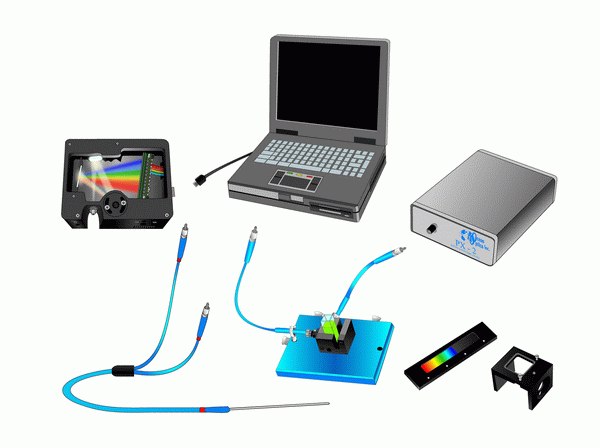 系統需要兩根光纖,其中一根用于照明,一根用于讀取數據。一個特別設計的CUV-ALL-UV樣品支架,這個支架可以用于吸收測量,當光纖90度連接的時候,就可以用于熒光測量,同時配上兩個熒光反光鏡,可以有效的提高熒光效率。