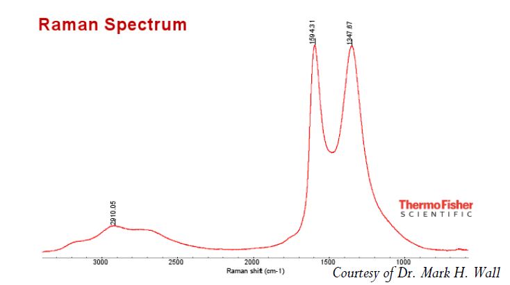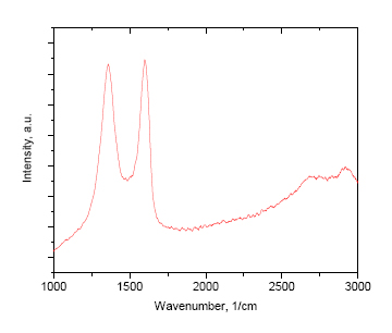 Properties: Concentration: 6.2 g/L Single Layer > 80% Flake Size: 0.5-5 Microns Color: Brown Highly Viscous Centrifugation has been used to prepare extra-large flakes and get an ultra-high concentration of Graphene Oxide. The ultra-highly concentrated graphene oxide forms paper-like substances and will coat virtually any surface, including the bottle itself. Production of Graphene Oxide: Graphene Oxide is the oxidized form of graphene produced by oxidizing crystal graphite with a mixture of sulfuric acid, sodium nitrate, and potassium permanganate (the Hummers method). Structurally, Graphene Oxide can be visualized as a graphene sheet with its basal plane decorated by oxygen-containing groups. Due to high affinity to water molecules by these groups, Graphene Oxide is hydrophilic and can be dissolved in water. The solubility in water makes the deposition of the thin films of the Graphene Oxide straightforward. Graphene Oxide is a poor conductor but its treatment by light, heat, or chemical reduction can restore most properties of pristine graphene. 拉曼圖像 |