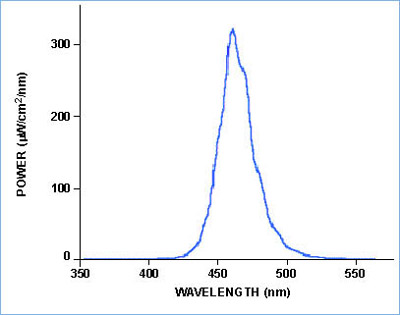 同樣提供LS-450,一種470nm 波長的LED,它可以采用范圍從380nm到640nm的LED。 LS-475可以提供一種相當穩定的輸出,并通過內置風扇降低溫度。它有一個SMA 905連接器,這就可以耦合光纖和一個濾光支架,它將放置25.4-mm圓或者50.8-mm方的濾光片,大3-mm厚。該產品附帶一個 800 mA, 12 VDC的電源。 LS-475 LED光源光譜輸出